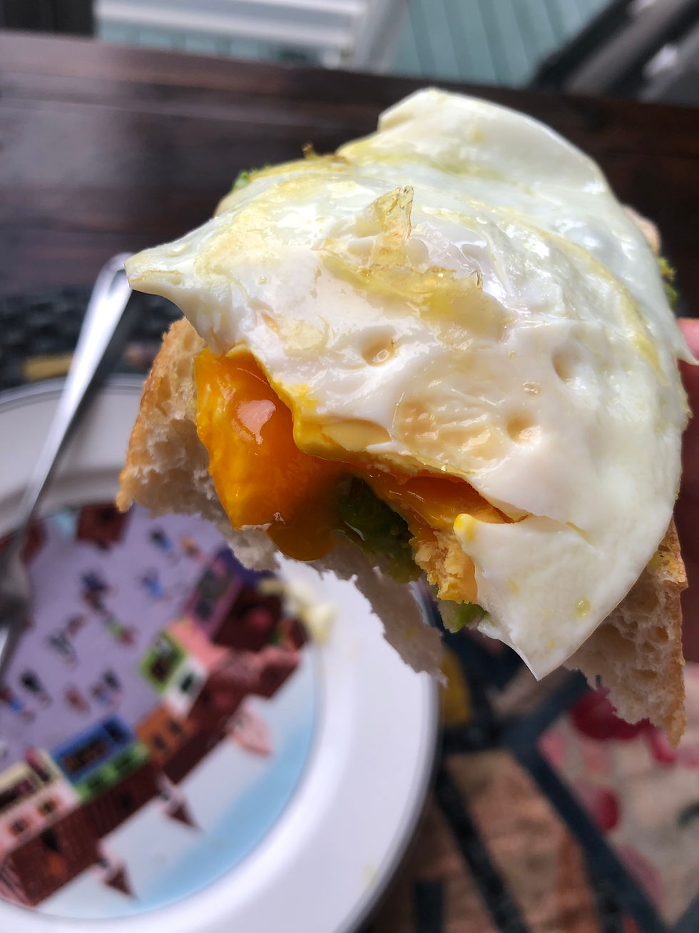 Sourdough, avocado from Uncle Mackey's house, farm-fresh egg. Look at that yolk! We waited in line at the farm and got a million eggs. We dropped some off with Aunty Yaechan and I think we're giving some to Karelen but in the meantime just eating em. The sign at the farm said OK eggs, but I think they're great!
