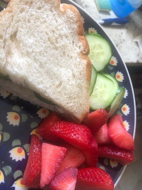 Irish butter on one bread, cream cheese with dill on the other bread, cucumbers in middle. With extra cucumbers and strawberries.