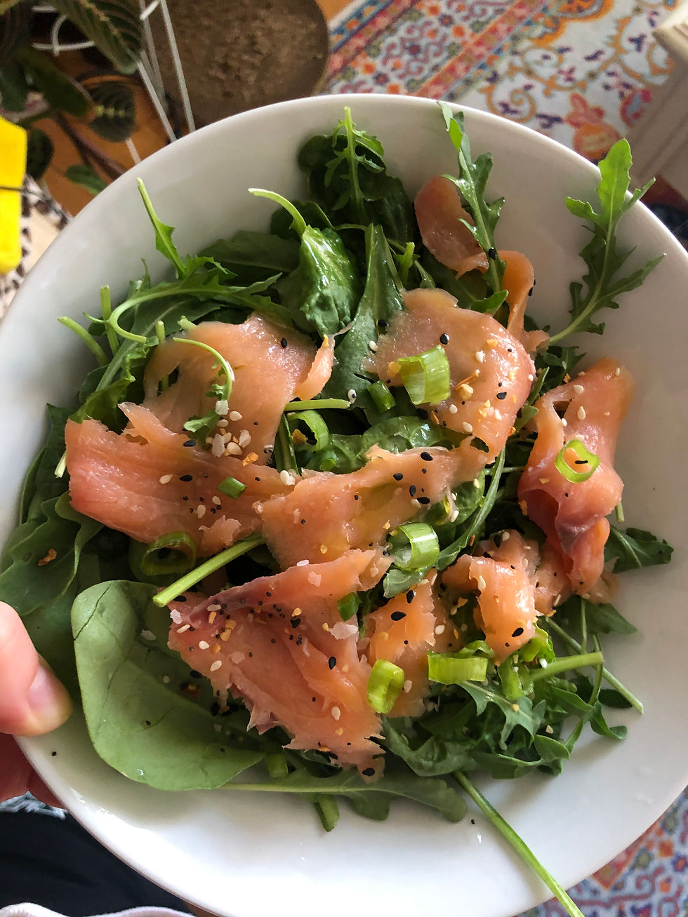 Spinach&Arugula mix, smoked salmon, everything but the bagel seasoning, green onions on top. Can't go wrong with bagel salad. Lemon juice and olive oil for dressing.